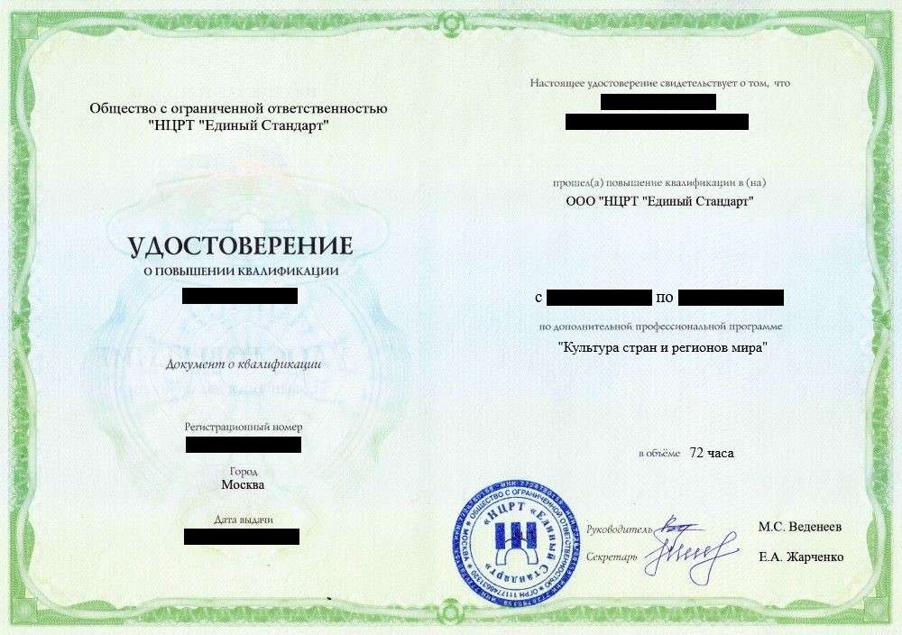 - Удостоверение о повышении квалификации установленного государством образца. Срок действия: 5 лет