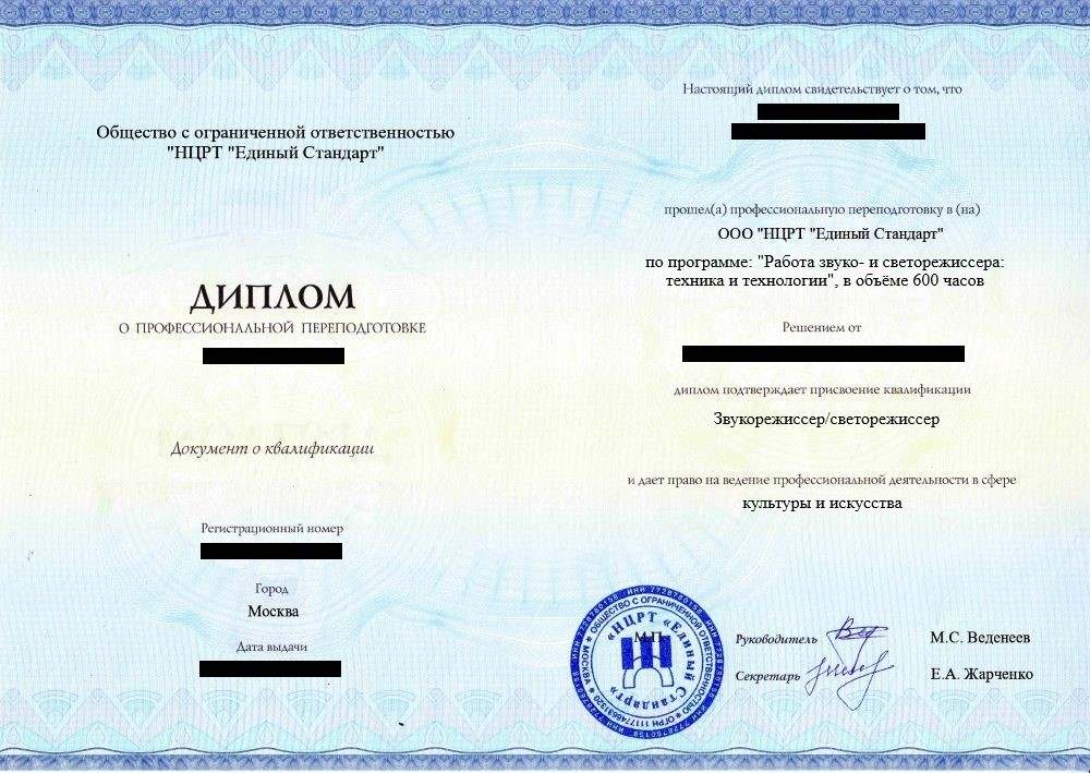 • «Звукорежиссер/светорежиссер» с правом ведения профессиональной деятельности в сфере культуры и искусства