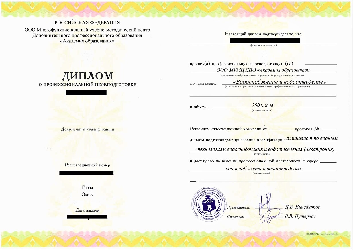 • «Специалист по водным технологиям водоснабжения и водоотведения (акватроник)» с правом осуществления профессиональной деятельности в сфере водоснабжения и водоотведения